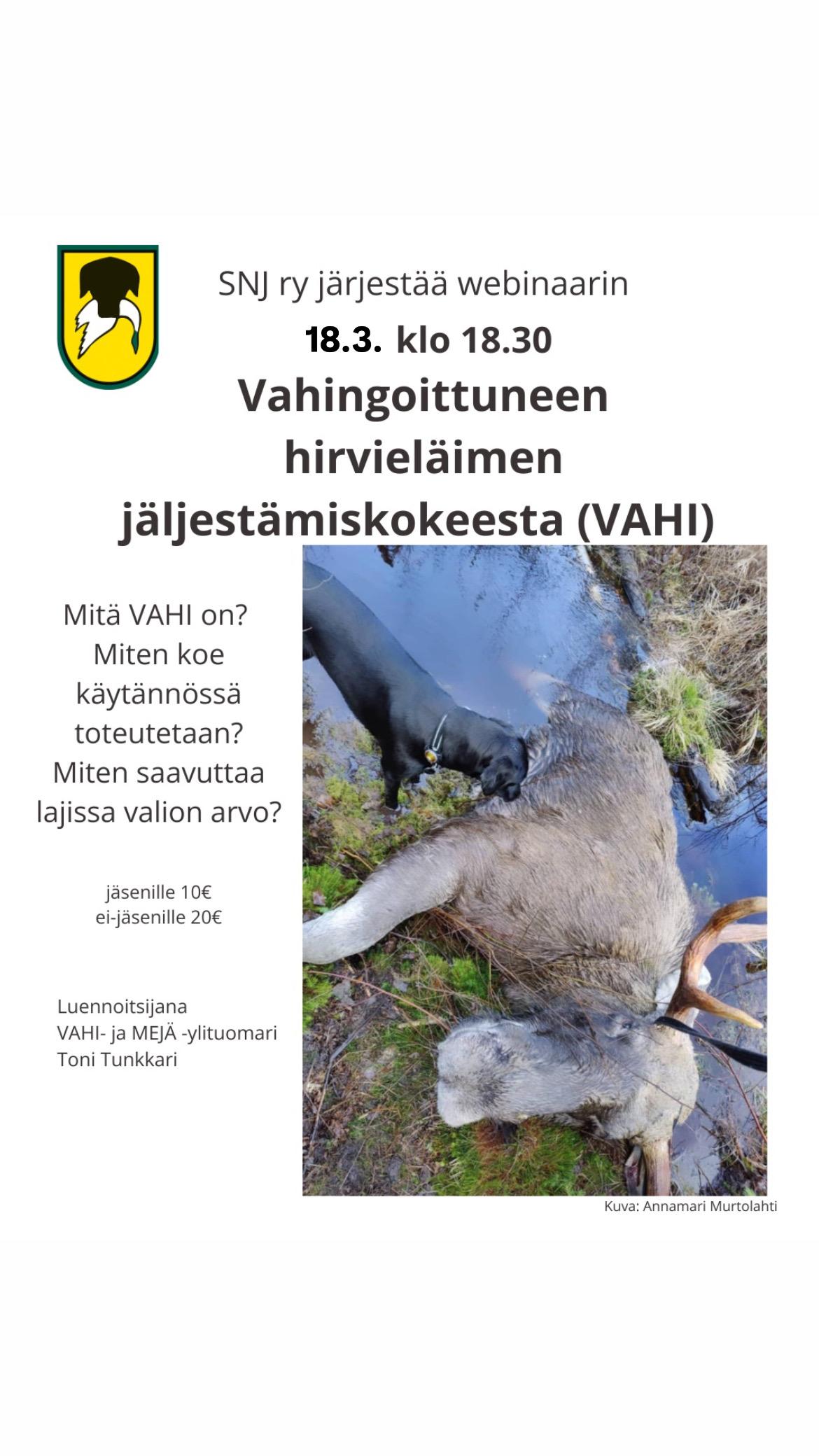 SNJ ry järjestää webinaarin aiheesta "Vahingoittuneen hirvieläimen jäljestämiskokeesta (VAHI).